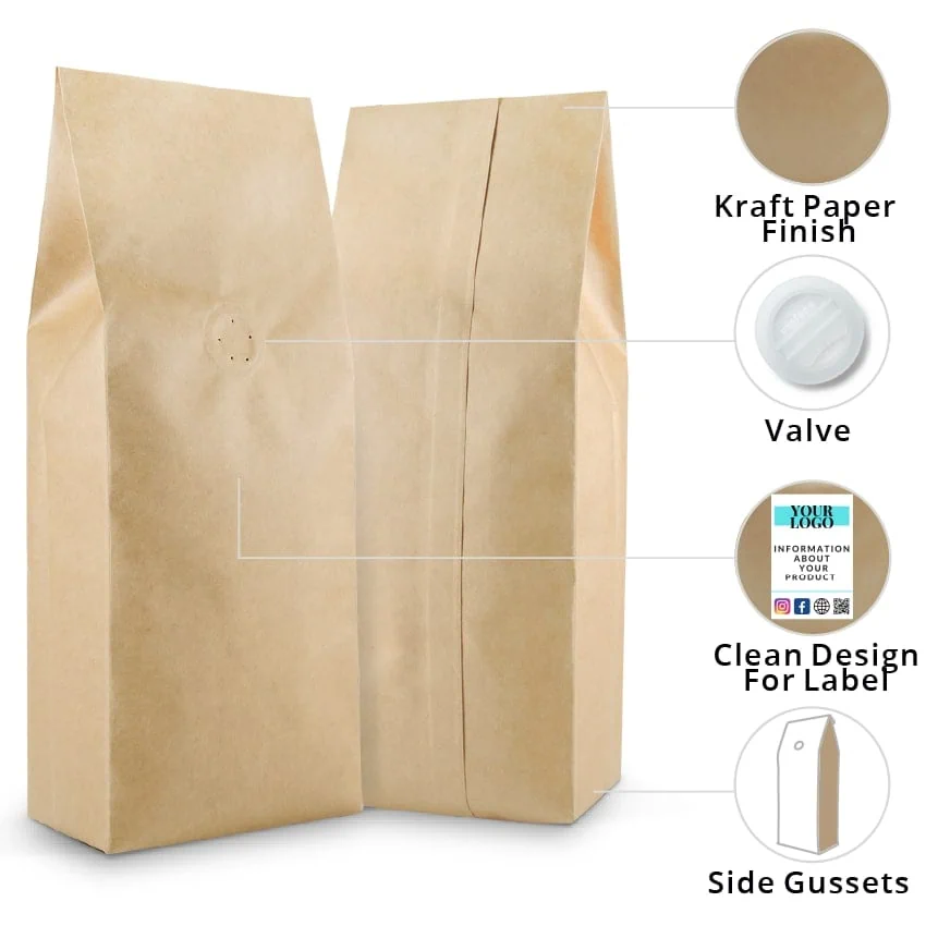 Available in more colours and materials than you’d expect: recyclable, compostable, kraft paper, matte, and shiny finishes. With or without valve. Pick what fits your brand and budget.